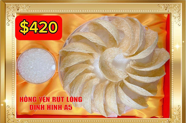 Yến sào Baby 450.000VND Hồng Yến Tinh Chế Trải Sợi 8.600.000VND Hồng Yến Rút Lông Định Hình A5 5.500.000VND Yến rút lông định hình A5 9.300.000VND Yến Tinh Chế Đắp Sợi 100% 8.600.000VND Yến trãi mặt lớp sợi dày 7.400.000VND